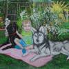 An attempt at copying a photograph of my youngest nephew, sitting on the grass in my Sisters lovely garden, with their two dogs.