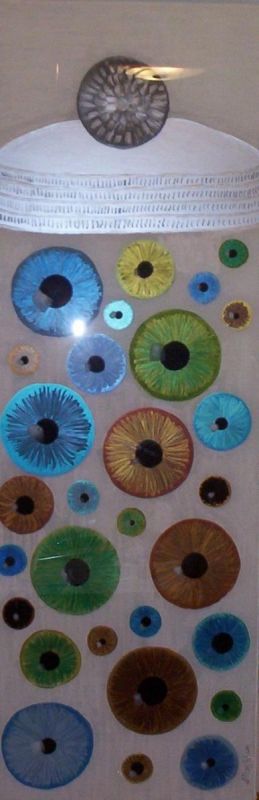 reverse painting on glass of a canister of eyes.