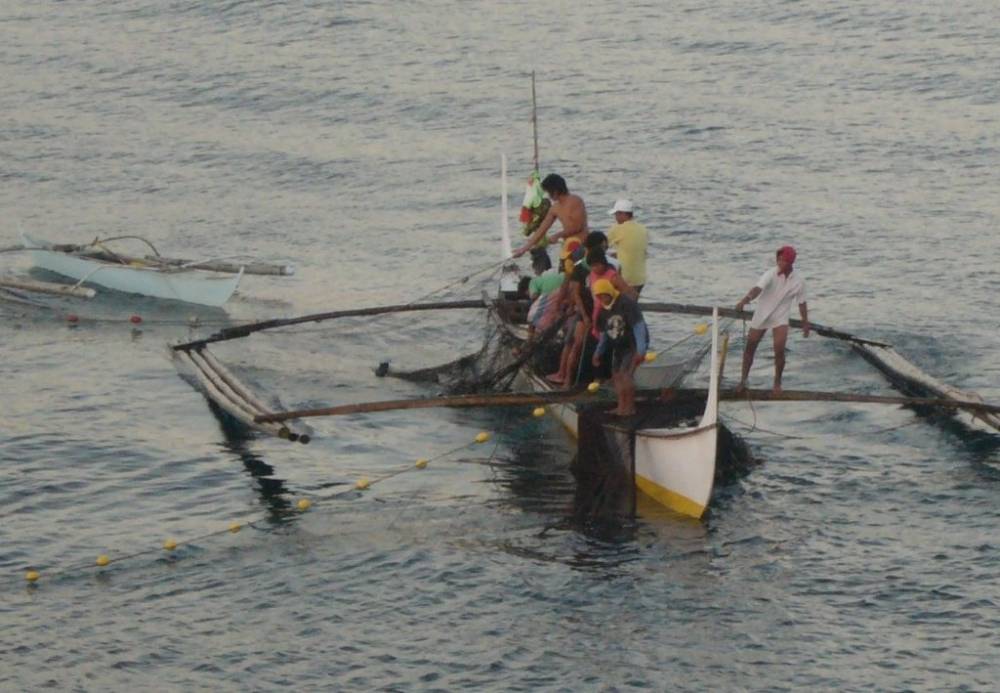 Filipino fishermen hauling their nets in the early morning. The local, wooden fishing boats with outriggers are know as "bangka," in this part of the Philippines.