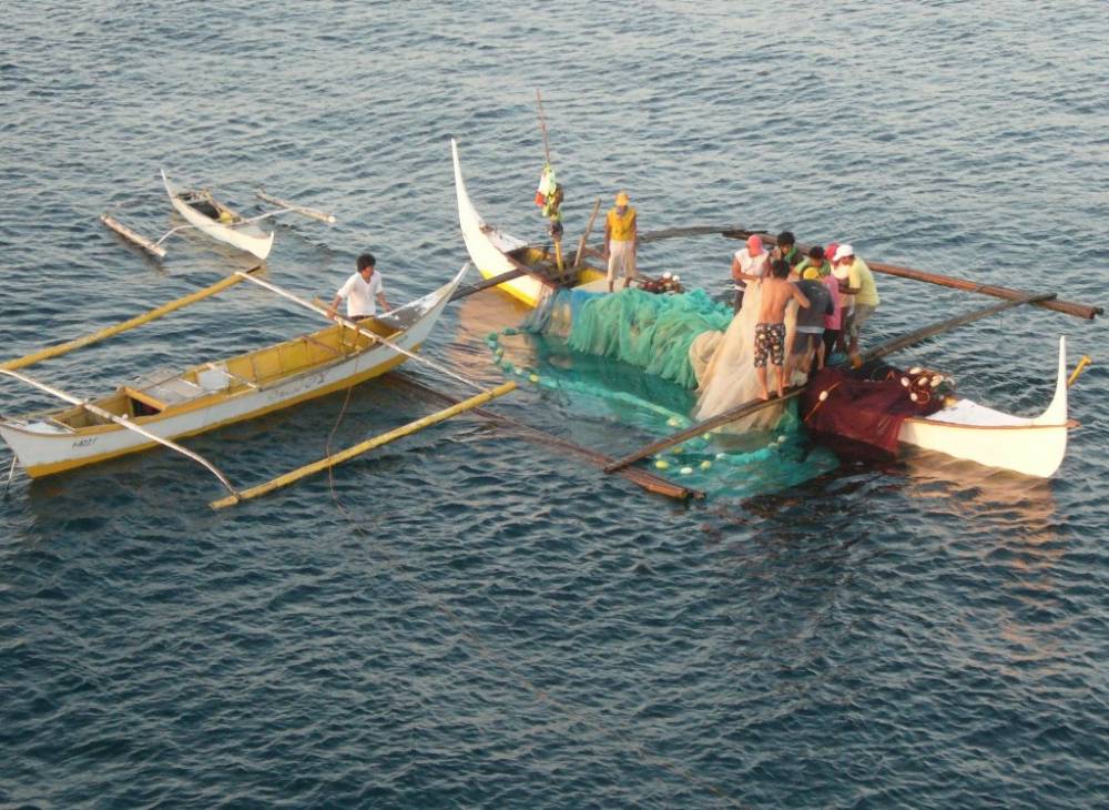 Filipino fishermen hauling their nets in the early morning. The local, wooden fishing boats with outriggers are know as "bangka," in this part of the Philippines.