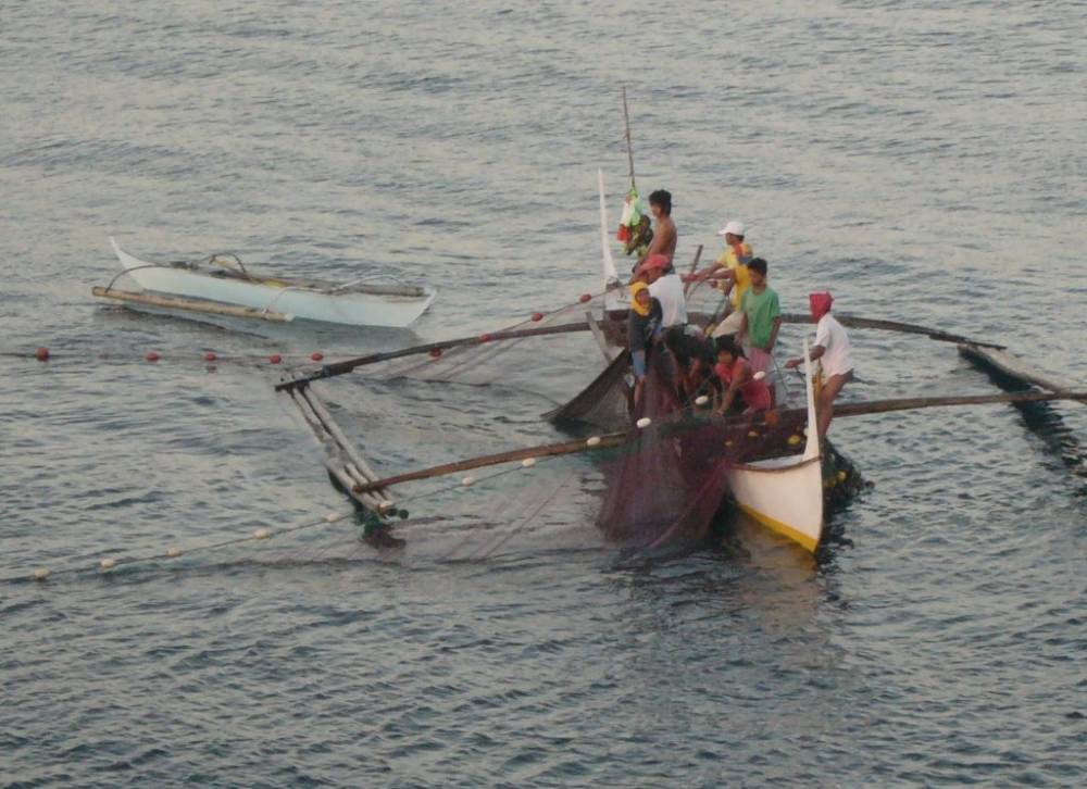Filipino fishermen hauling their nets in the early morning. The local, wooden fishing boats with outriggers are know as "bangka," in this part of the Philippines.