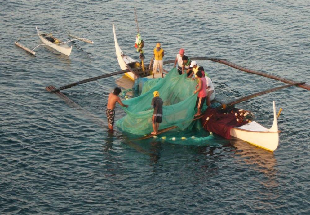 Filipino fishermen hauling their nets in the early morning. The local, wooden fishing boats with outriggers are know as "bangka," in this part of the Philippines.
