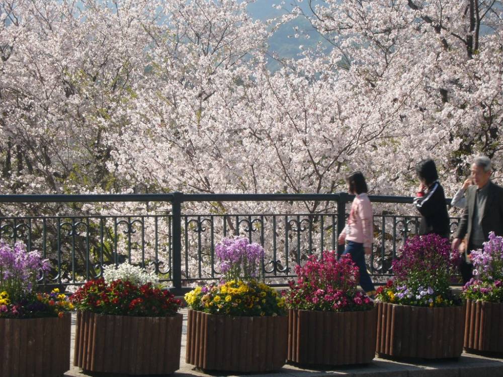Cherry trees (sakura) in full blossom in a park next to the Atomic Bomb Museum in Nagasaki, Kyushu, Japan - April 7, 2006