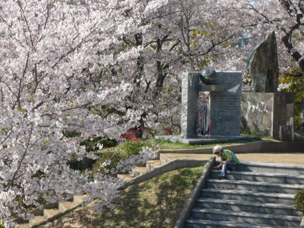 Cherry trees (sakura) in full blossom in a park next to the Atomic Bomb Museum in Nagasaki, Kyushu, Japan - April 7, 2006