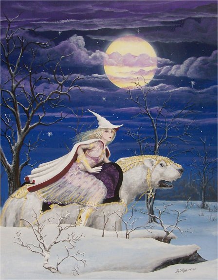 A white witch riding on a white wolf in the snow