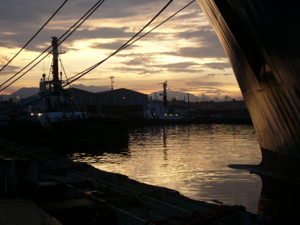 The bow of the Global Marine Systems Ltd cable ship, c.s. Cable Retriever can be seen to the right of the picture, with the beautiful colors of the sunset reflected in the water.