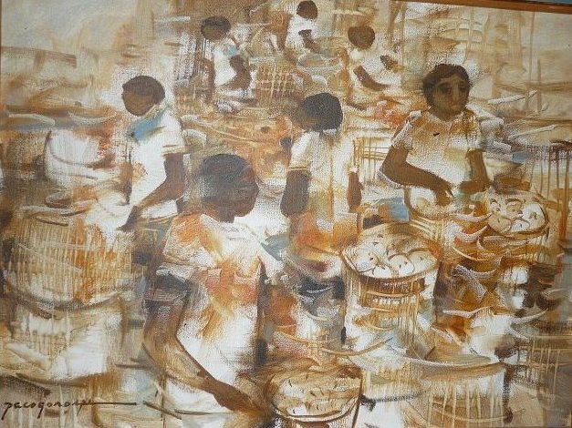 QuoteI have two framed oil canvas paintings by the above artist. I do not know the name of them, but they are very similar to the one shown on your photo-strip - supplied by Lisa Arenberg. It is untitled - looks like a group of Filipino workers (men) in white working with perhaps fabrics, or fish net???. The one I have matches almost perfectly, but with only five workers in the scene. I have another that looks like Filipino women workers preparing and placing items into baskets or bins - possibly fish??They measure approximately 26" X 18" and are in good shape - the frames are either intentionally distressed, or have been knocked around a bit, not sure.