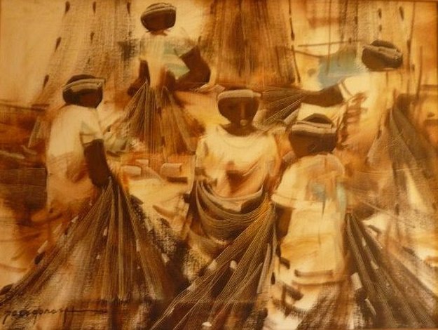 QuoteI have two framed oil canvas paintings by the above artist. I do not know the name of them, but they are very similar to the one shown on your photo-strip - supplied by Lisa Arenberg. It is untitled - looks like a group of Filipino workers (men) in white working with perhaps fabrics, or fish net???. The one I have matches almost perfectly, but with only five workers in the scene. I have another that looks like Filipino women workers preparing and placing items into baskets or bins - possibly fish??They measure approximately 26" X 18" and are in good shape - the frames are either intentionally distressed, or have been knocked around a bit, not sure.