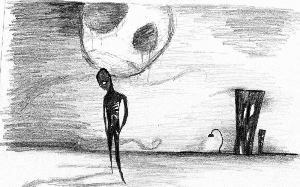 The only shadow that night was standing alone, in the background horizon the skeleton houses stood silhouetted and decayed. He did not look up for the stars this time to again beg for a friend, because the moon had tired with him and comitted suicide.
