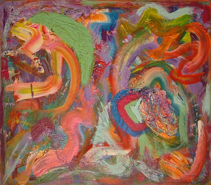 Paint agitated on Masonite surface with brushes, palette knives, sponges, chopsticks, nails, hair dryers, and air blown out of my mouth.
