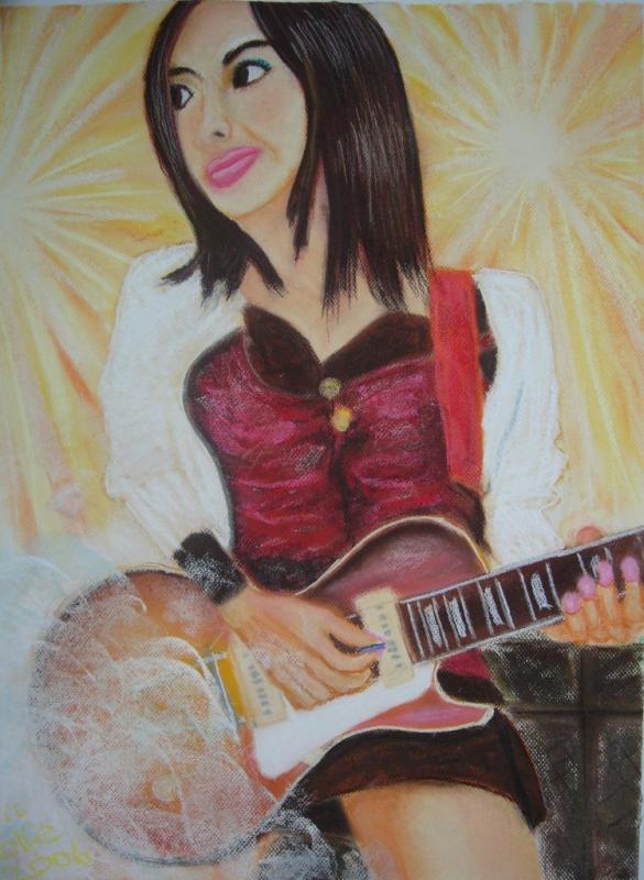 A pastel painting of Philippine pop / rock star Barbie Almalbis on stage with her guitar. This was my second attempt at this painting. It was copied from an advertisement for Golds Gym that appeared in the Philippine Star of May 15, 2006. Barbie Almalbis is one of my favorite Filipina pop / rock stars. She looks great, she is a very intelligent girl and she is a highly accomplished musician! (She's also very fit - thanks apparently to Golds Gym!)