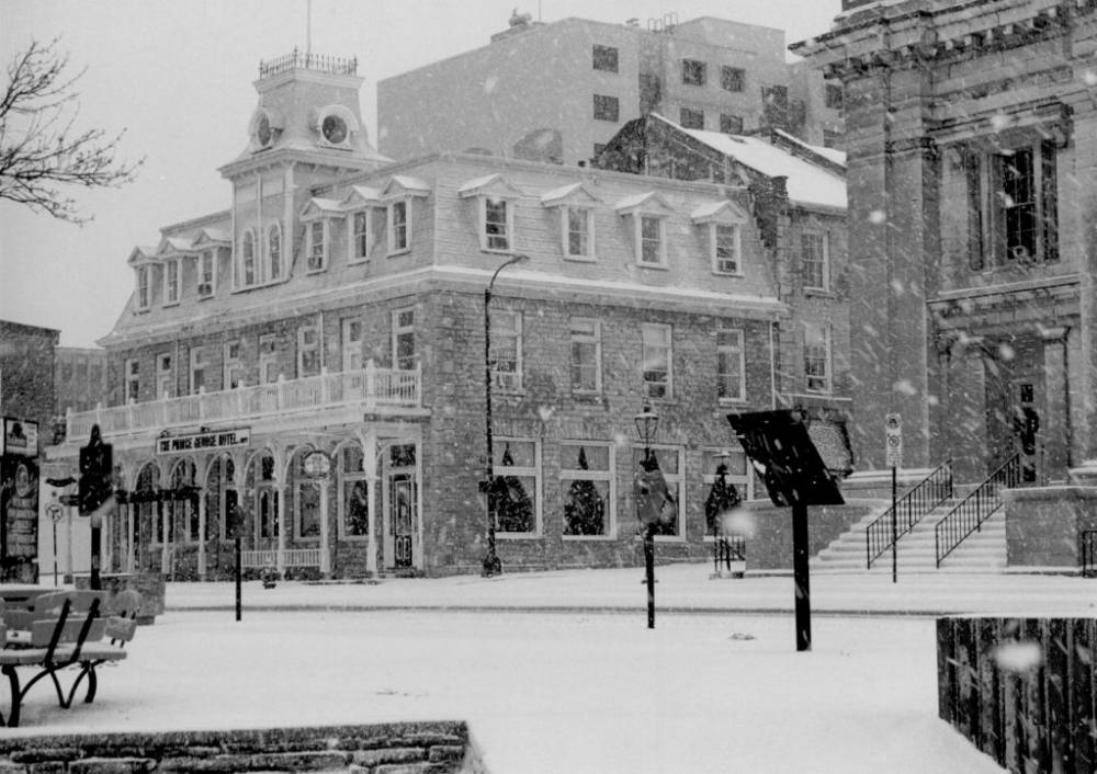 Kingston in winter. A snowy street scene with the Price George Hotel.