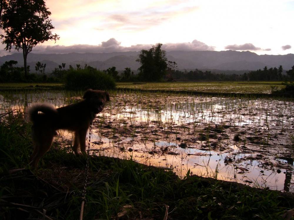 An evening twilight view, with a beautiful sunset reflected in the water of one of the palayan (rice fields,) near to the Madilosa residence in Davao del Sur. I don't know the name of the dog, but I call him "Scruffy!" Being taken for walks was quite a noval experience for him and, as you can see, he was really enjoying himself here!