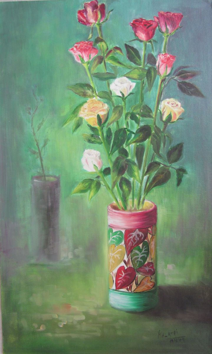 Still life with some pretty roses in a very pretty little painted flower vase.