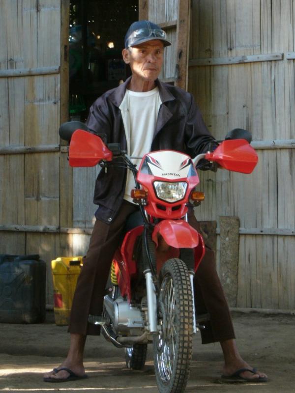 Lolo Madilosa, a very friendly old Filipino farm labourer, sitting impatiently on his bike. The reason for that angry glare is that he has been waiting for about 15 minutes for his youngest daughter, Jelyn, to get ready for school! (Needless to say, when Jelyn finally appeared, she came out with the most charming smile on her sweet face! She know's that she is his little princess and she can get away with being just a few minutes late!)