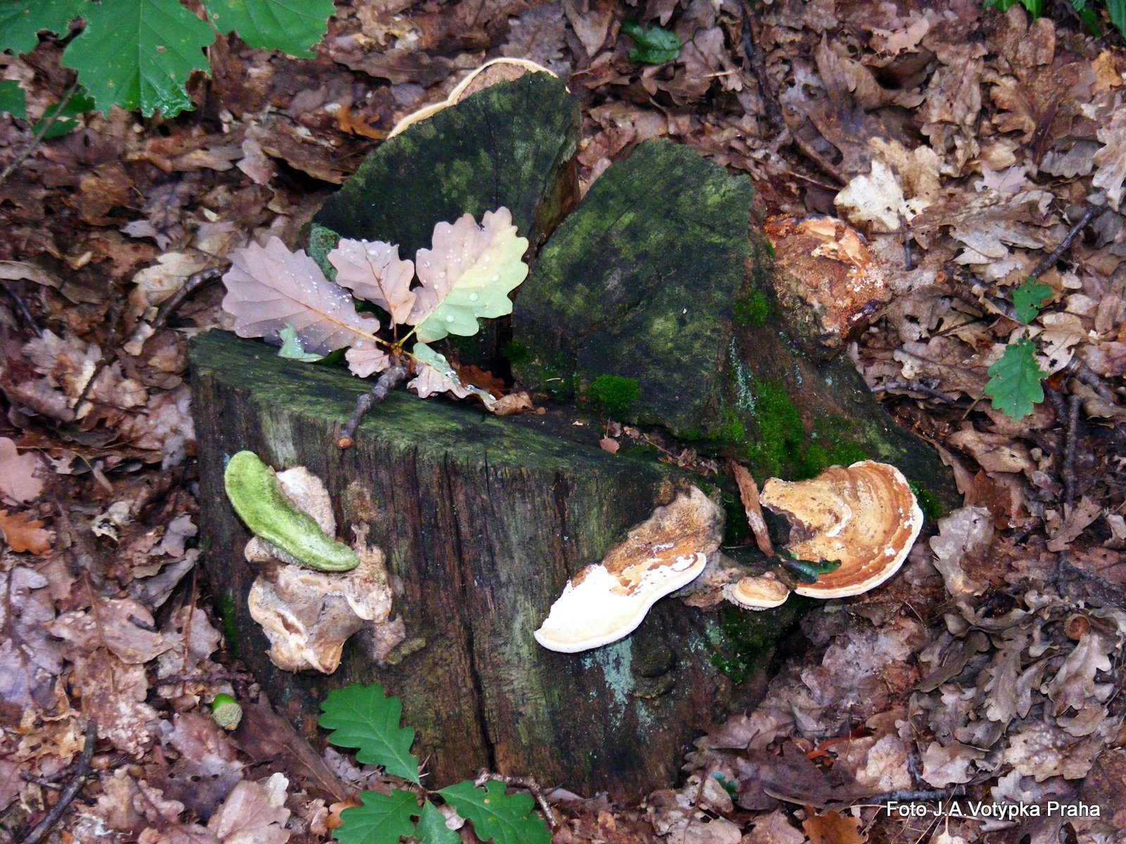 Fungi, moss and some oak leaves on an old tree stump in an oak tree woodland.