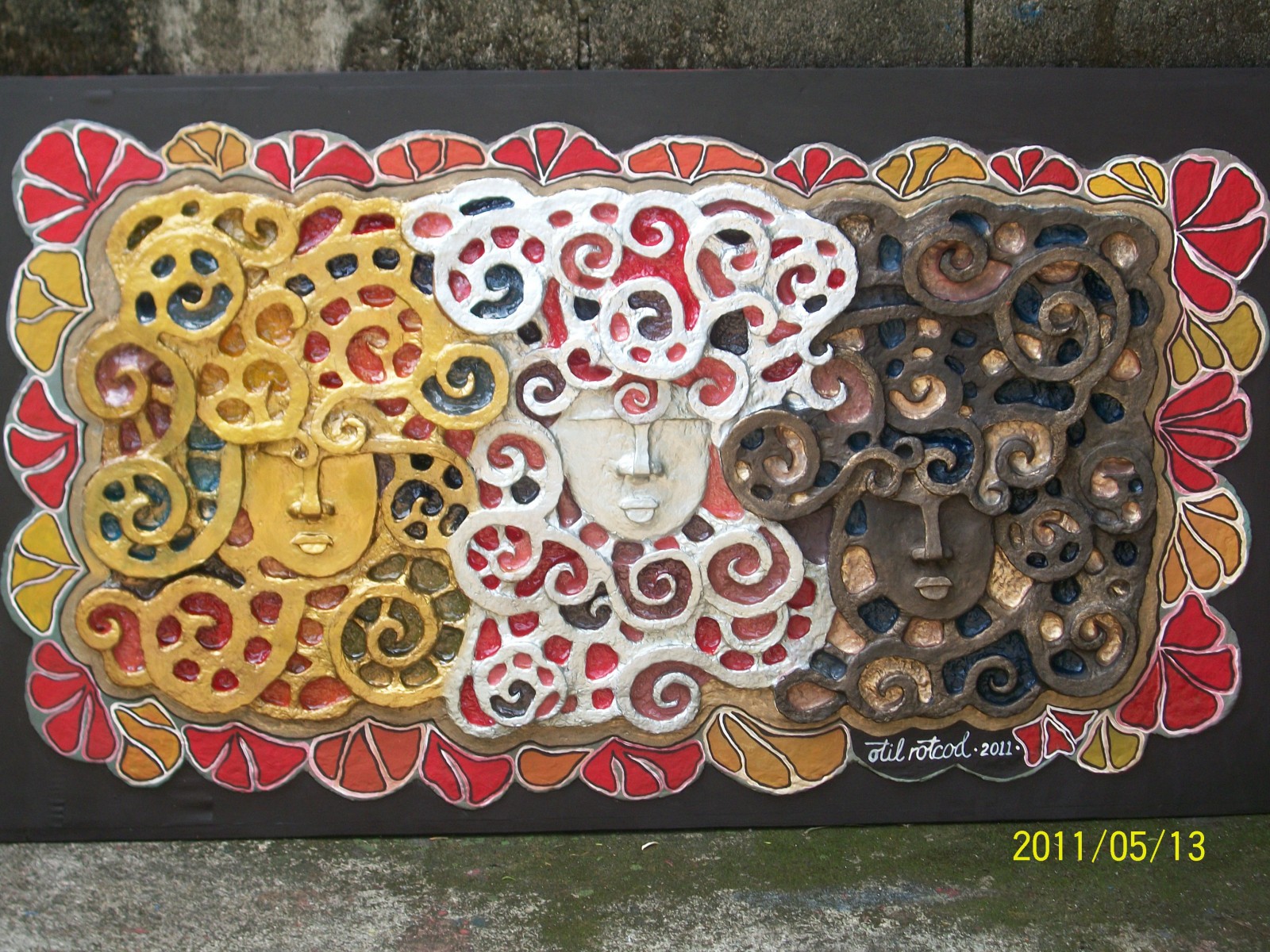 A MASK VERSION OF THE SPANISH-PILIPINO BELIEF OF THE FRONT STEPS OF THE HOUSE WHICH IS ORO(GOLD), PLATA(SILVER),& MATA(DEATH). A MODERN TRANSLATION OF EXPRESSION OF THAT BELIEF. A 5 FT.X2FT.8INCHES. SELLING AT P 50,000.00 DOOR TO DOOR DELIVERY INCLUDED