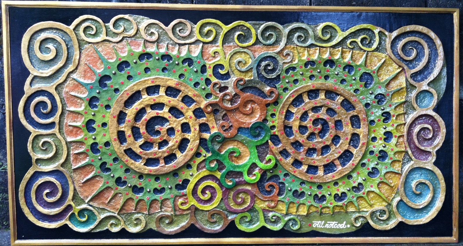 All handmade papier mache artwork. About the cycle of life, thus karma, with embellishment.