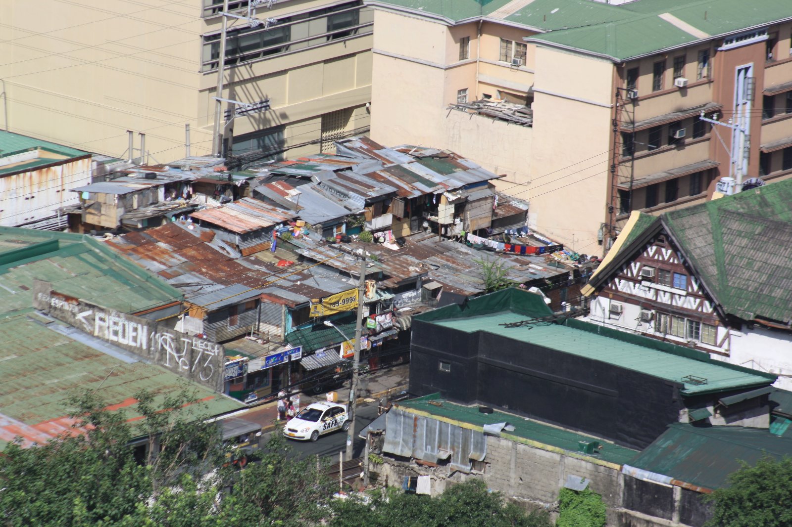 Ramshackle tin rooftops on a building in M.H. Del Pilar Street, Ermita, City of Manila, as seen from the living room of my city residence on the 32nd floor of a condominium tower in Adriatico Street.