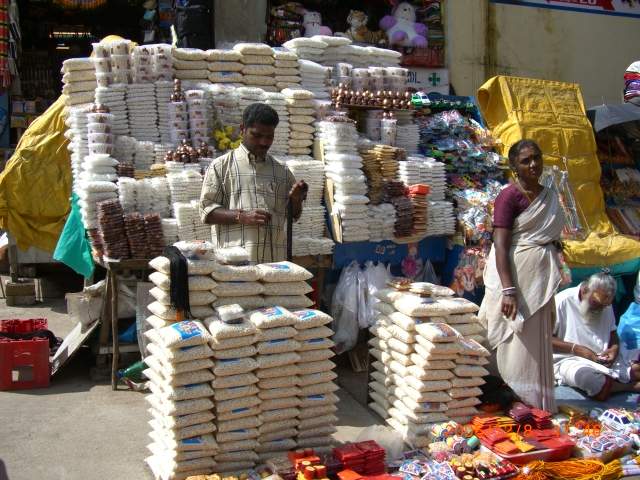 A colourful market stall, selling sugar, salt and other daily necessities.