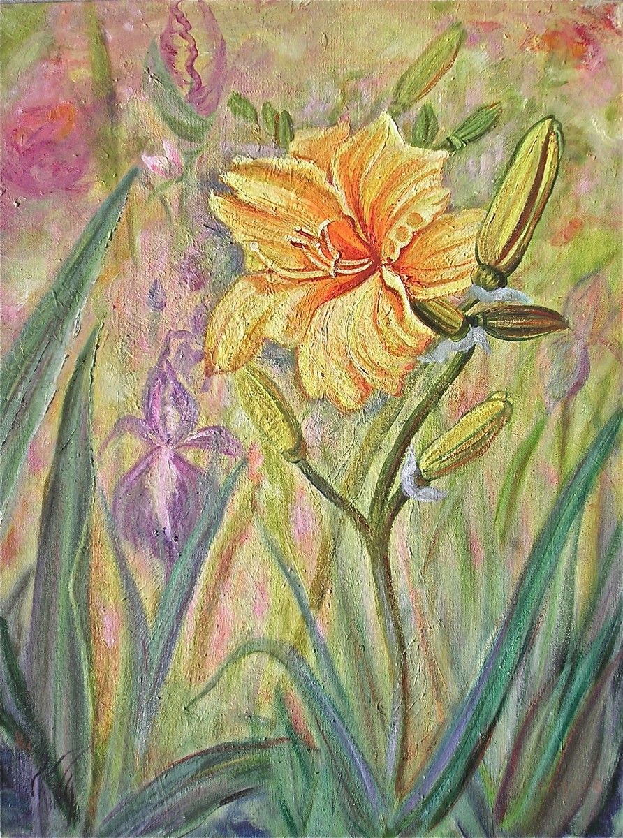 A yellow Day Lily set against a tapestry of garden of flowers. Sides are painted as a continuation of front- 20" x 16" x 1.5"- oil on Gallery Wrapped canvas