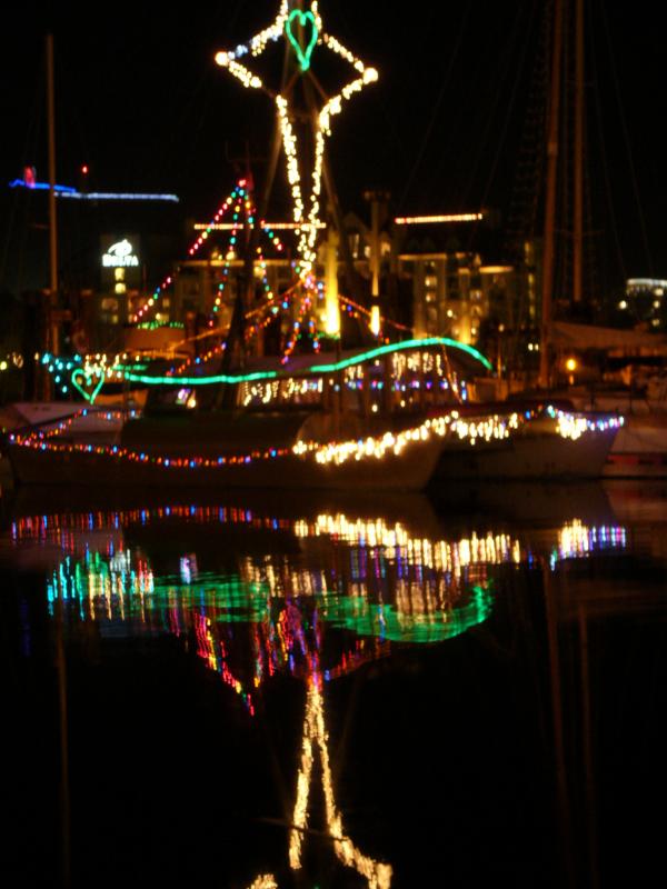 Some colorful lights, reflected in the water of the inner harbour at Victoria, B.C. (Canada,) on Christmas day, 2006