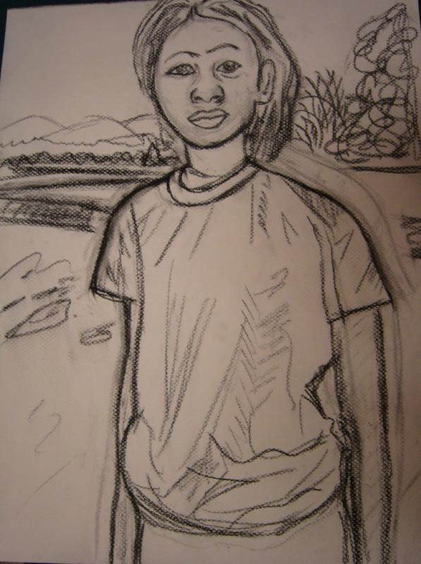 Looking at my initial sketch, in 'Stage One,' I realised that I had got Shein Mae's shoulders far to big. They looked more like those of a seasoned lumberjack! You can still see the erasure marks on this one. I am never afraid of erasing - especially in the early stages of a painting... 'Much better to get the initial sketch right, from the start. It's almost impossible to change the fundamental shapes in a painting once you have done any real amount of work on it...