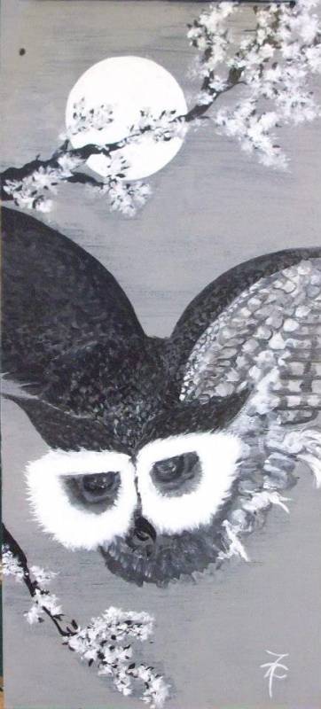 I love owls. Acrylic on wood. I love how his eyes look like sunglasses :-)