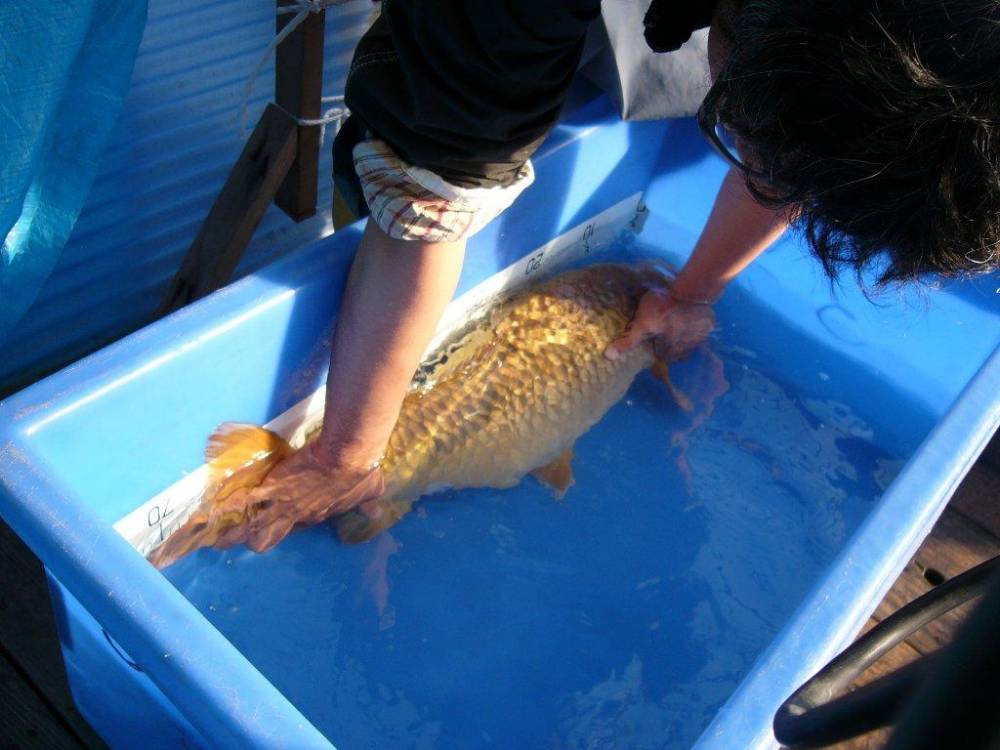 Gin-rin Chagoi Ohgon cross Kawarimono Nishiki-goi - currently in the very capable hands of Matsumoto-san of Rishouen (Koi dealers) in Ishida, Kokura, Kita Kyushu, Japan (January, 2007)