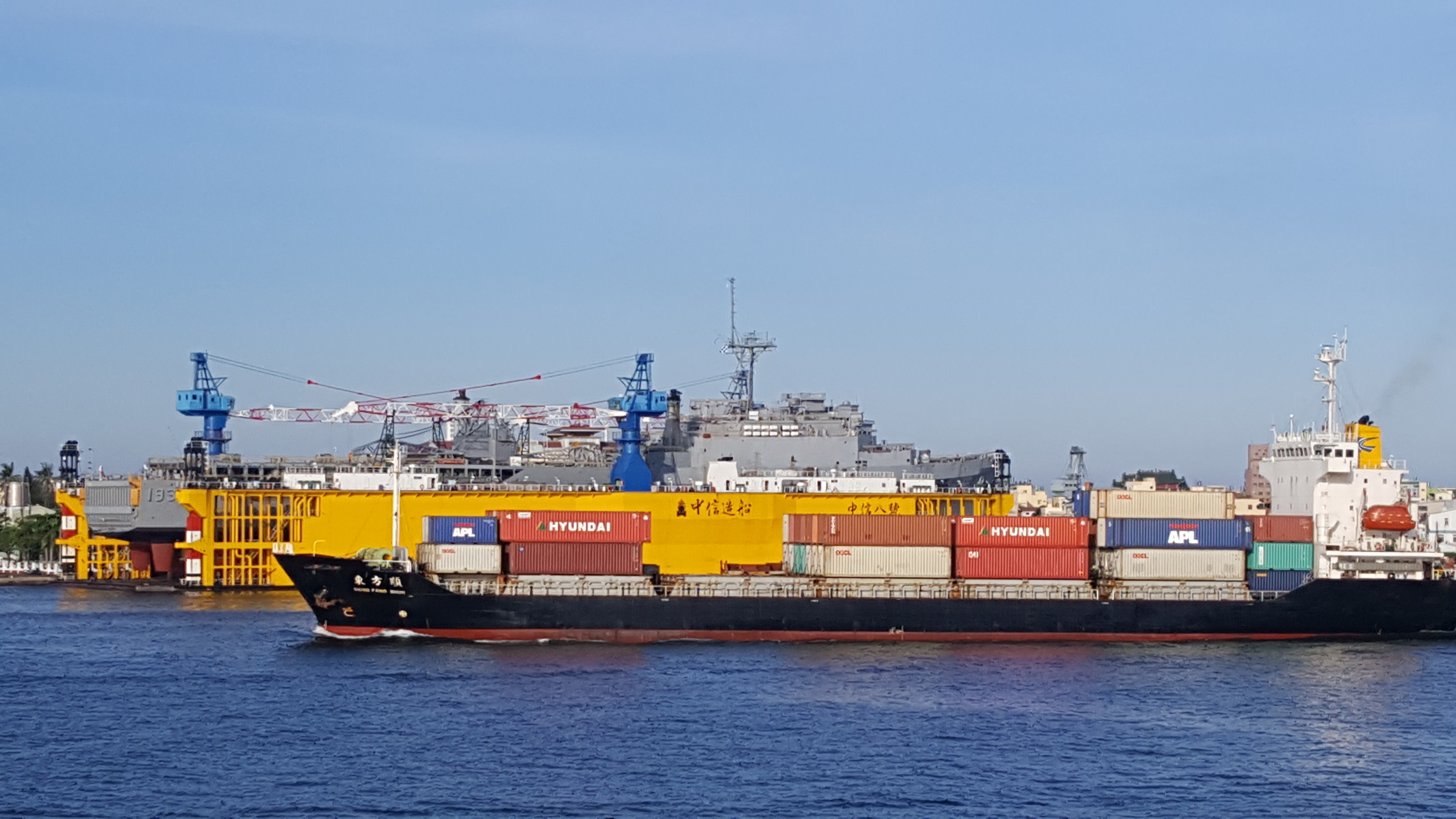 A smallish feeder-type container vessel passing the Jong Shyn No. 8 floating dock in Kaohsiung - August, 2016