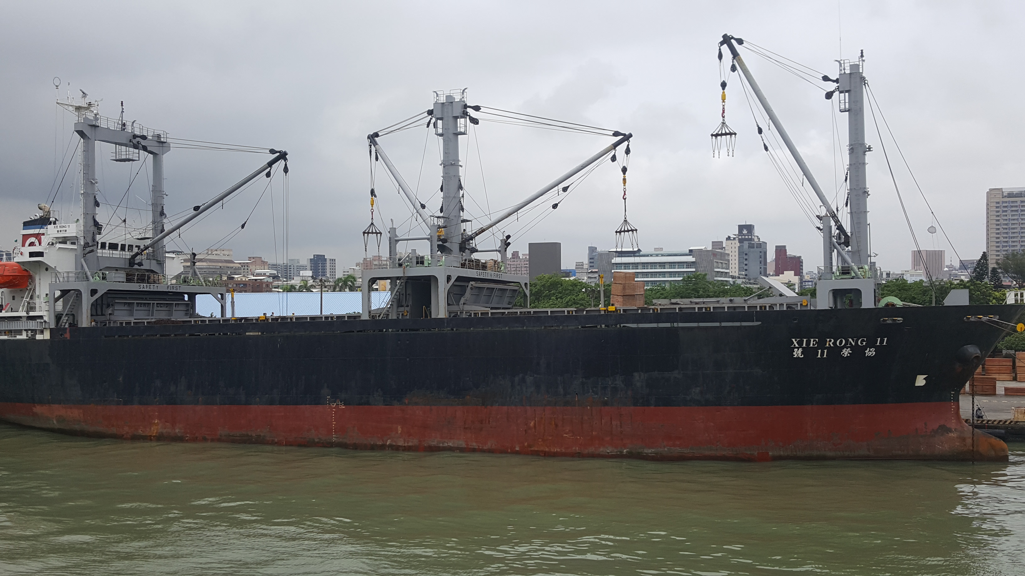 The cargo ship Xie Rong II tied-up alongside and discharging a break-bulk cargo in the port of Kaohsiung, Taiwan - August 2016