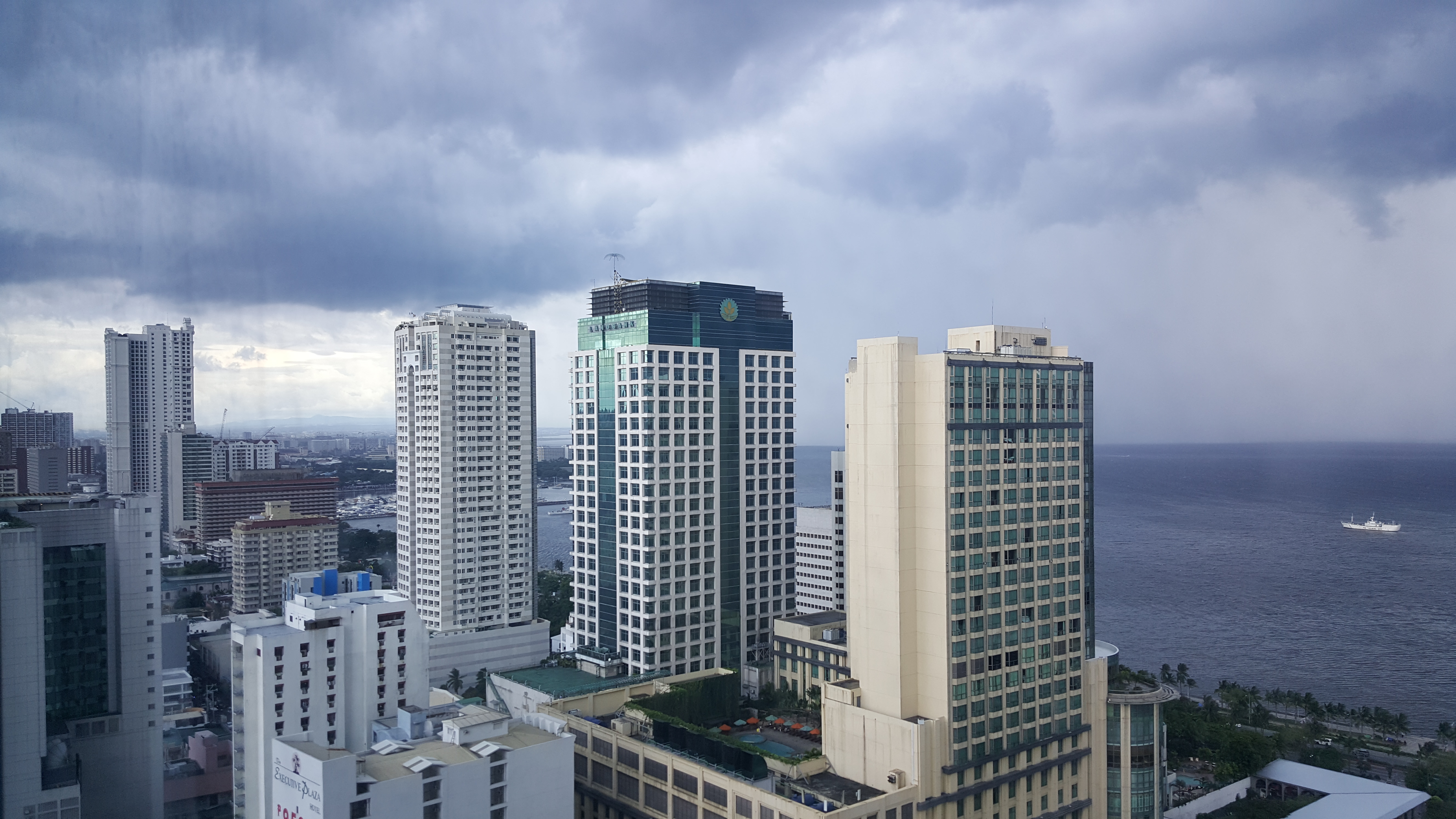 A rain-laden sky over Malate, City of Manila, Philippines. In the foreground is the Hyatt Hotel and the Landbank building - with the Manila Yacht Club and the Admiral Baysuites hi-rise condominium in the background of the photo.