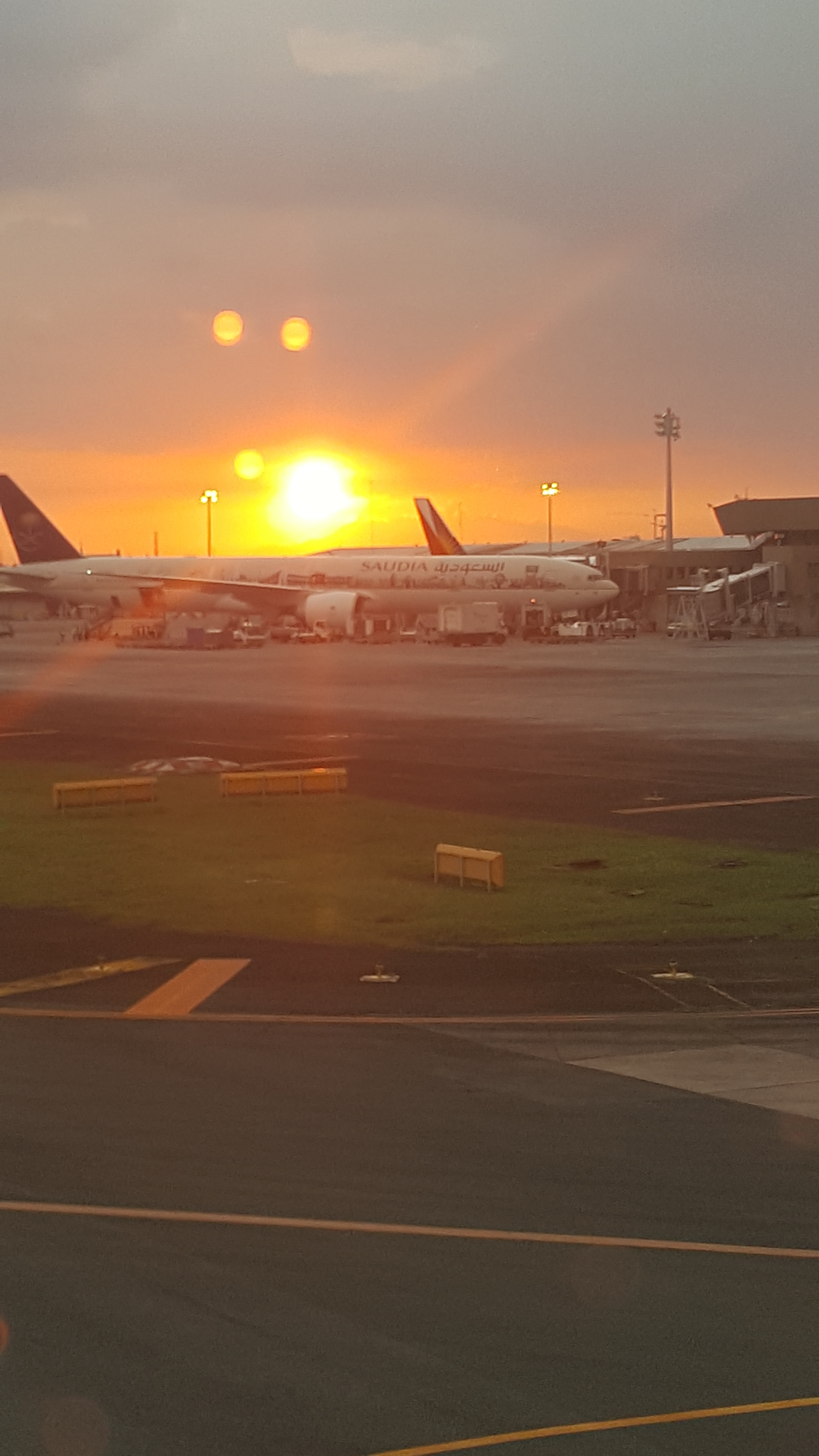 A Saudia aircraft and one belonging to Philippine Airlines can be seen silhouetted against a brilliant sunset.