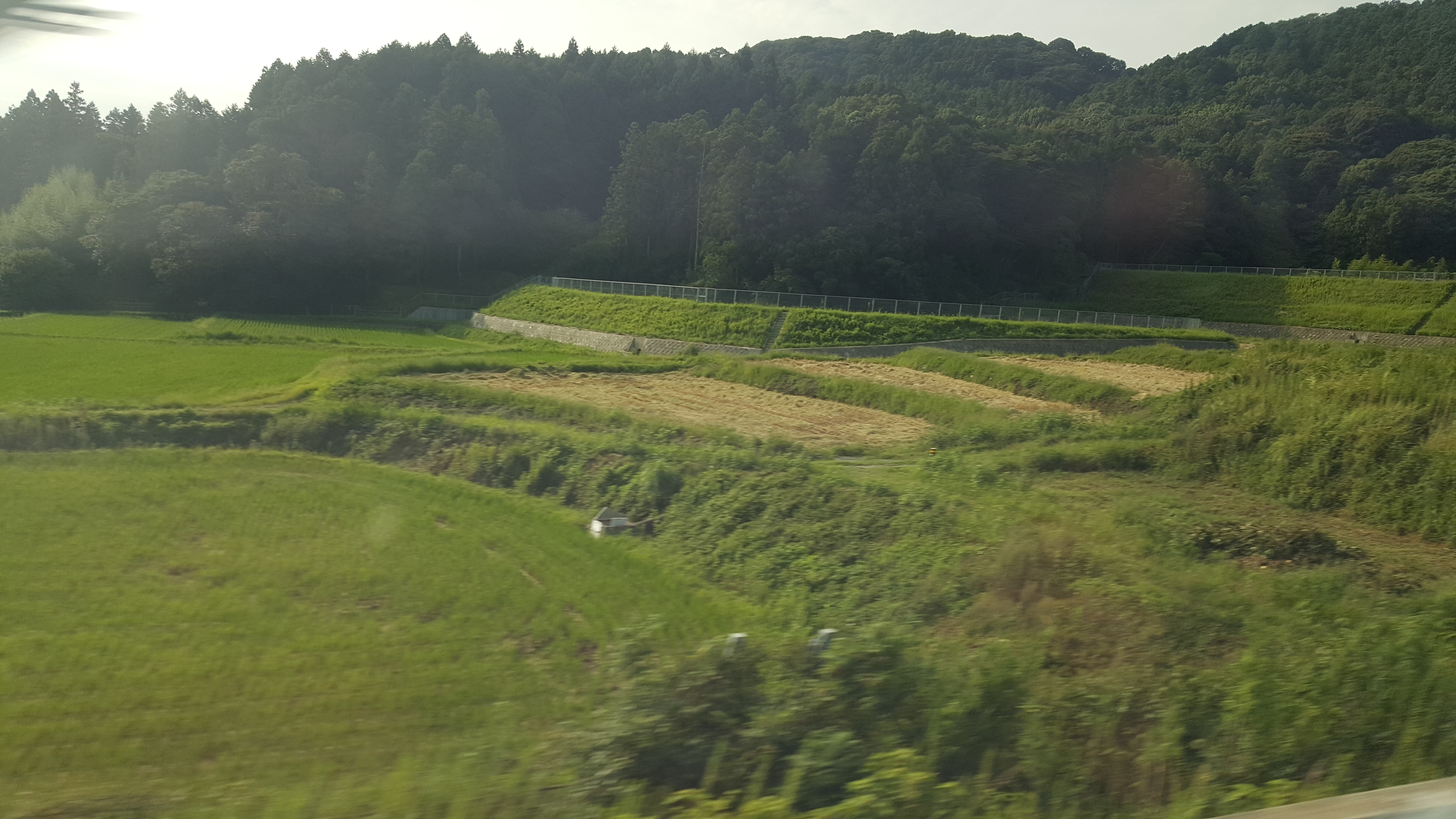 Beautiful Japanese countryside, viewed from the window of a train on the Shinkansen ("New Trunk Line"), travelling at speed between Kokura and Hakata.