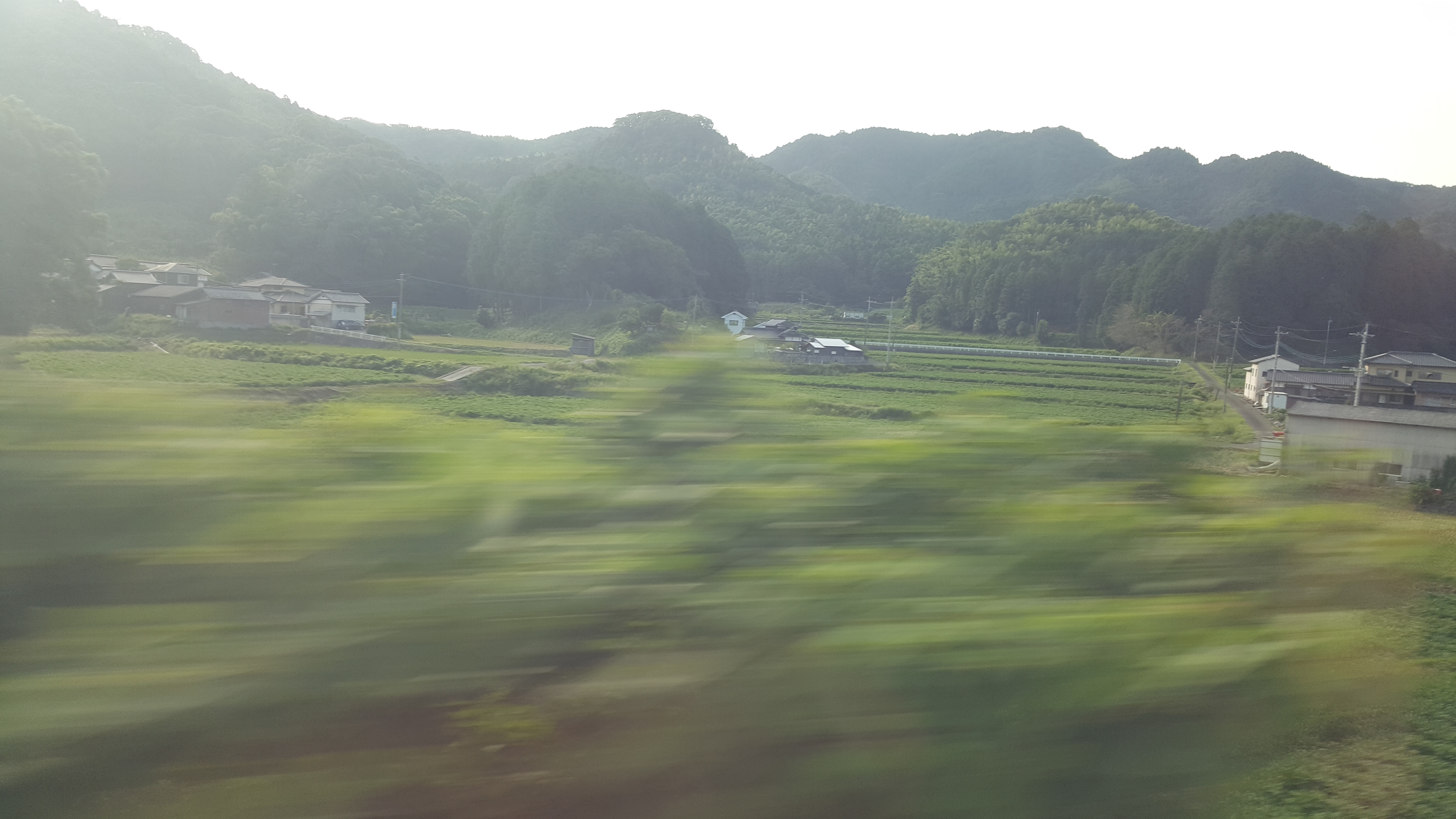 新幹線の窓口から外え見る。新幹線の速さが十分に一杯
