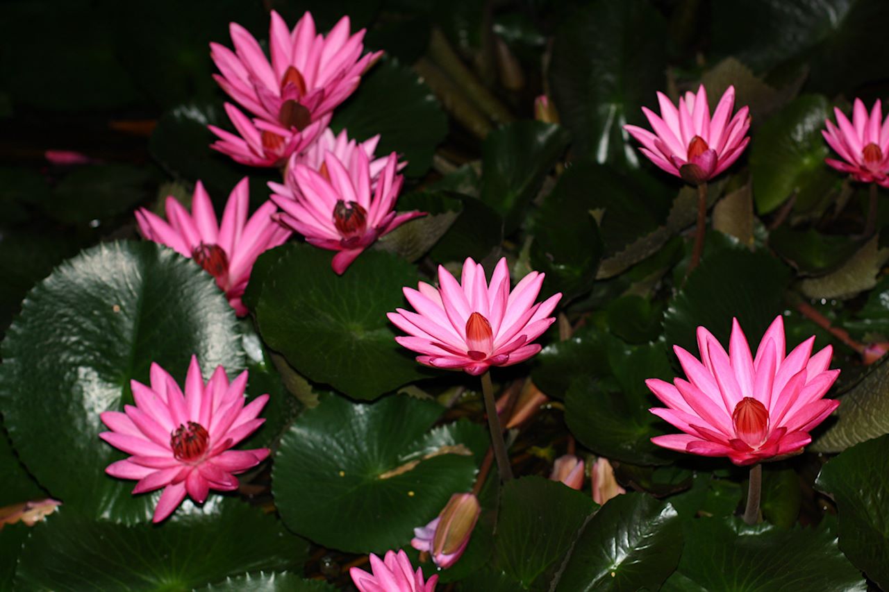 Pink Tropical Water Lilies (or "Lotus," if you prefer!) These beautiful lilies grow in a ditch beside the road in Soi Sukjai, between Soi 40 and Soi 42 off the Sukhumvit Road in Bangkok. Apparently, they were just thrown in there, years ago, by the owner of the house behind were they grow. Like most tropical water lilies, the flowers only open at night...
