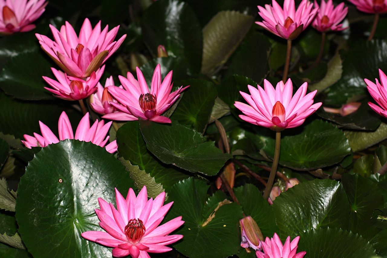Pink Tropical Water Lilies (or "Lotus," if you prefer!) These beautiful lilies grow in a ditch beside the road in Soi Sukjai, between Soi 40 and Soi 42 off the Sukhumvit Road in Bangkok. Apparently, they were just thrown in there, years ago, by the owner of the house behind were they grow. Like most tropical water lilies, the flowers only open at night...