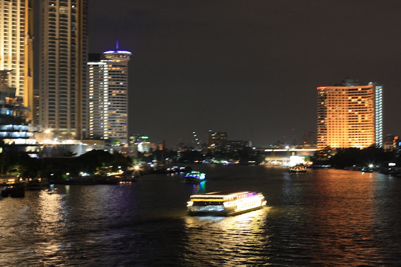 Bangkok night scene with high rise buildings and a ferry boat on the Jao Praya River.jpg