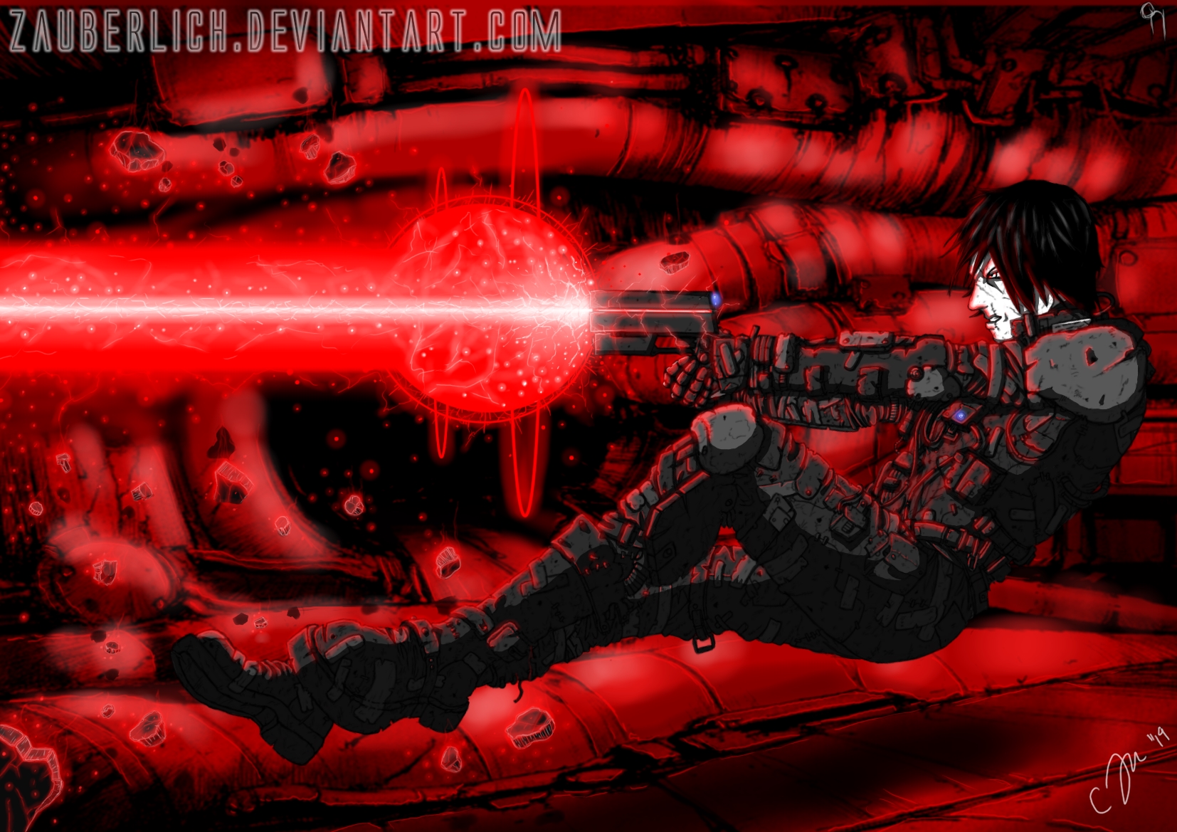 Finally done, Killy blasting away with his GBE [Gravitational Beam Emitter] from the Manga series/Animated Film BLAME! by Tsutomu Nihei. This was a ton of fun to make! The background is actuallyt an edited image from the manga which I thought would be a little more fitting than drawing my own.