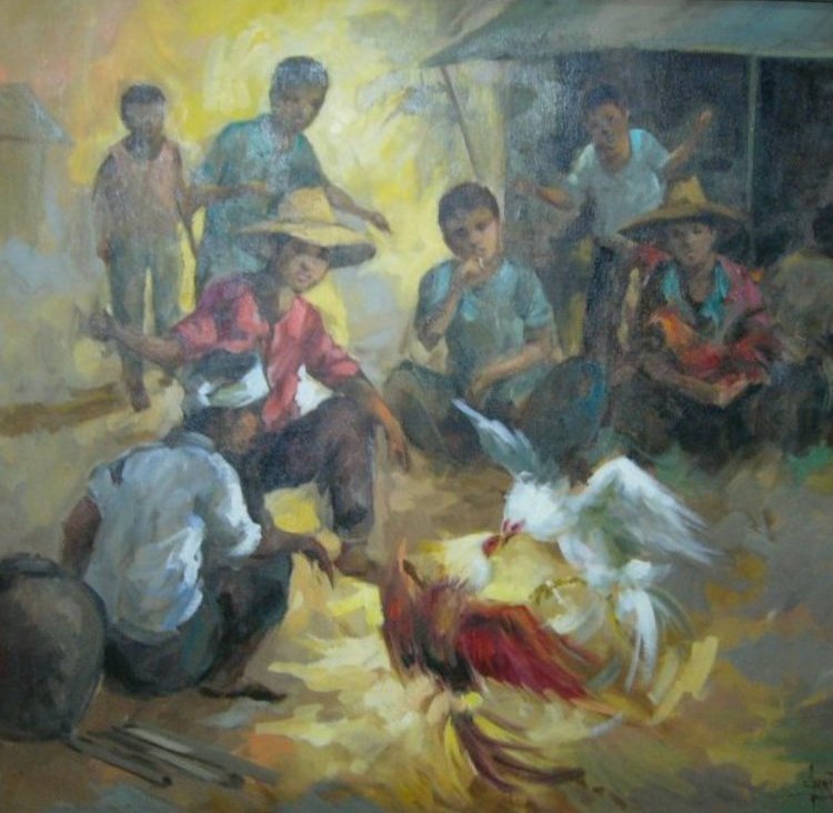 A Mike Herrera painting depicting a cock-fight (or "sabong") scene in the Philippines. "Sabong" being the cockfight, the guys with their prize cockerels are. of course the "sabongeros!"