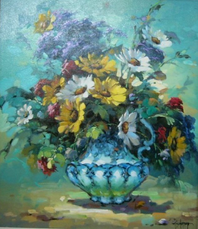 A floral still-life with painting with flowers in a vase, by the late, great Filipino artist Mike Herrera.