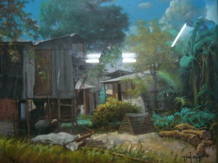 A watercolour framed behind glass, of a night scene with wooden shacks in a village in the rural Philippines.