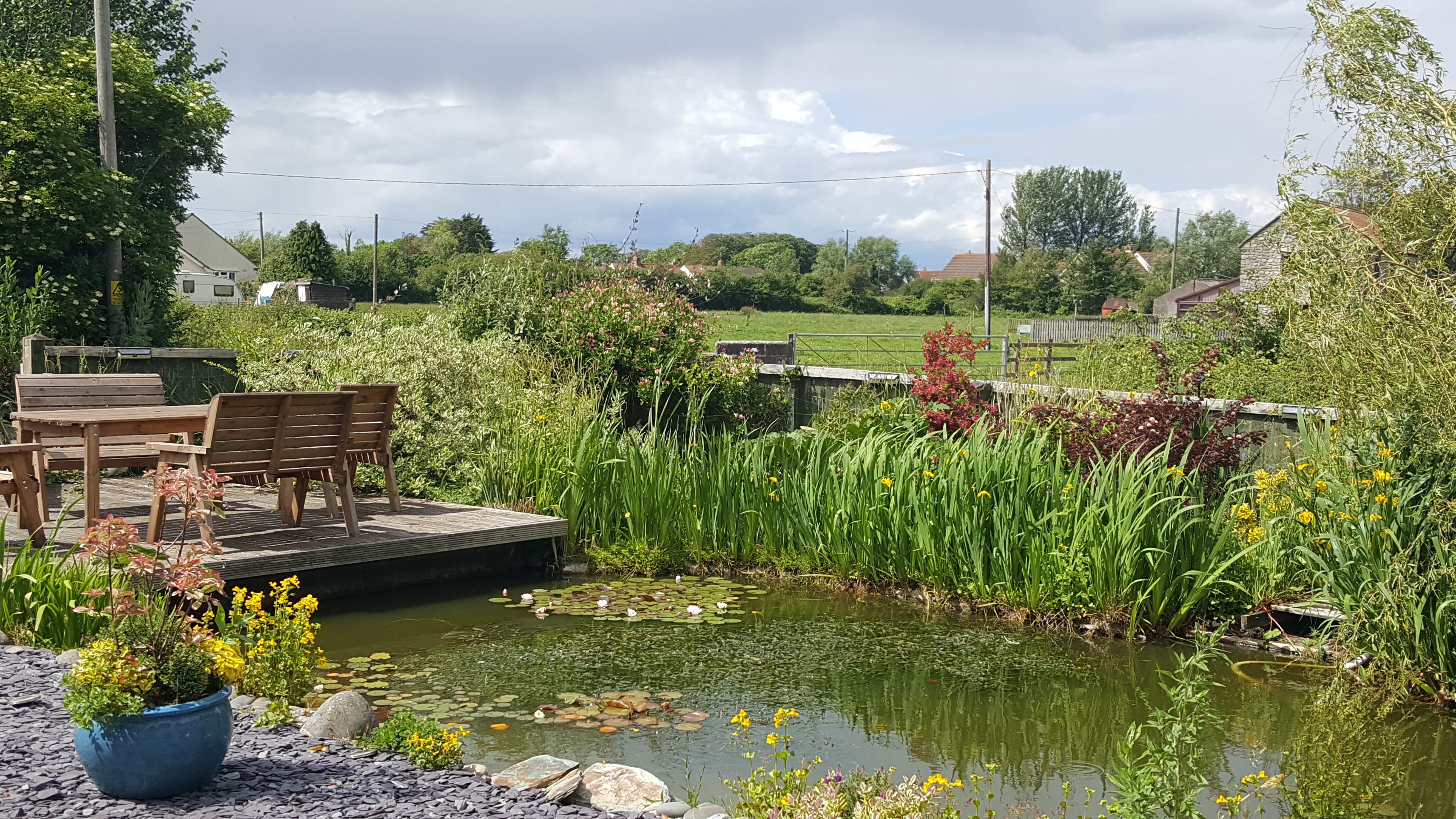 The pond, surrounded by flowers, contains some nice koi and it is set against a backdrop of beautiful Somerset countryside and farmland on a sunny day in early summer.