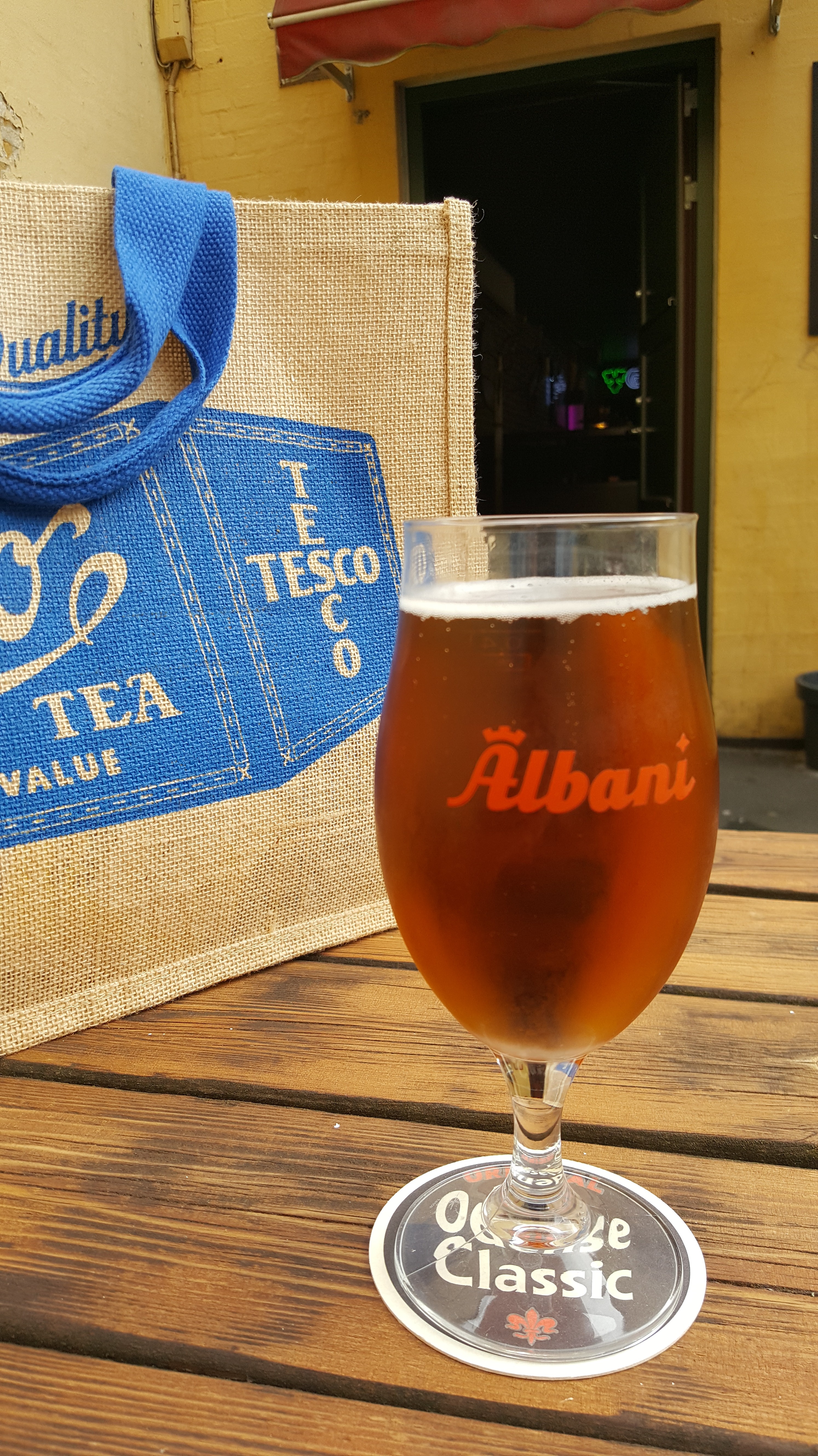 A glass of Odense Classic beer and a Tesco's ecobag waiting to be filled at Fotex in Kalundborg