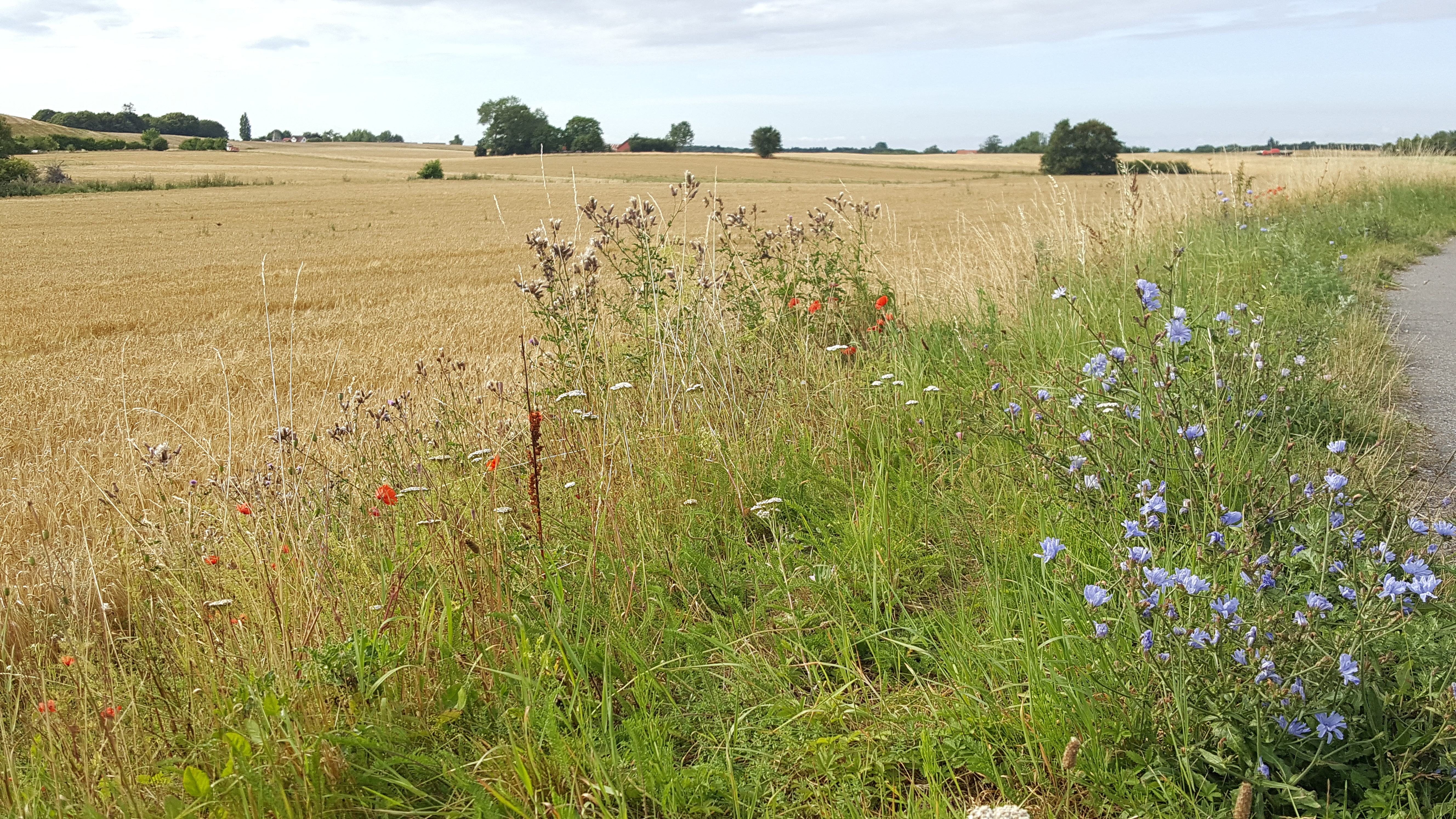 Pretty blue wildflowers and some red poppies beside a field of ripe grain, all ready for the summer harvest