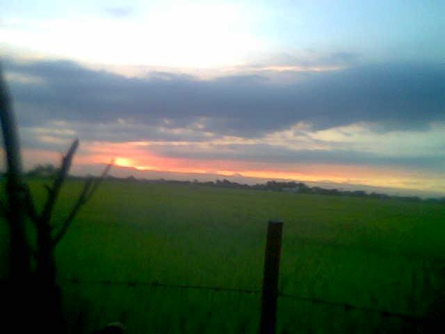 A beautiful sunset over a rice field, (palayan,) full of green, young "palay," in Bulucan Province, Philippines
