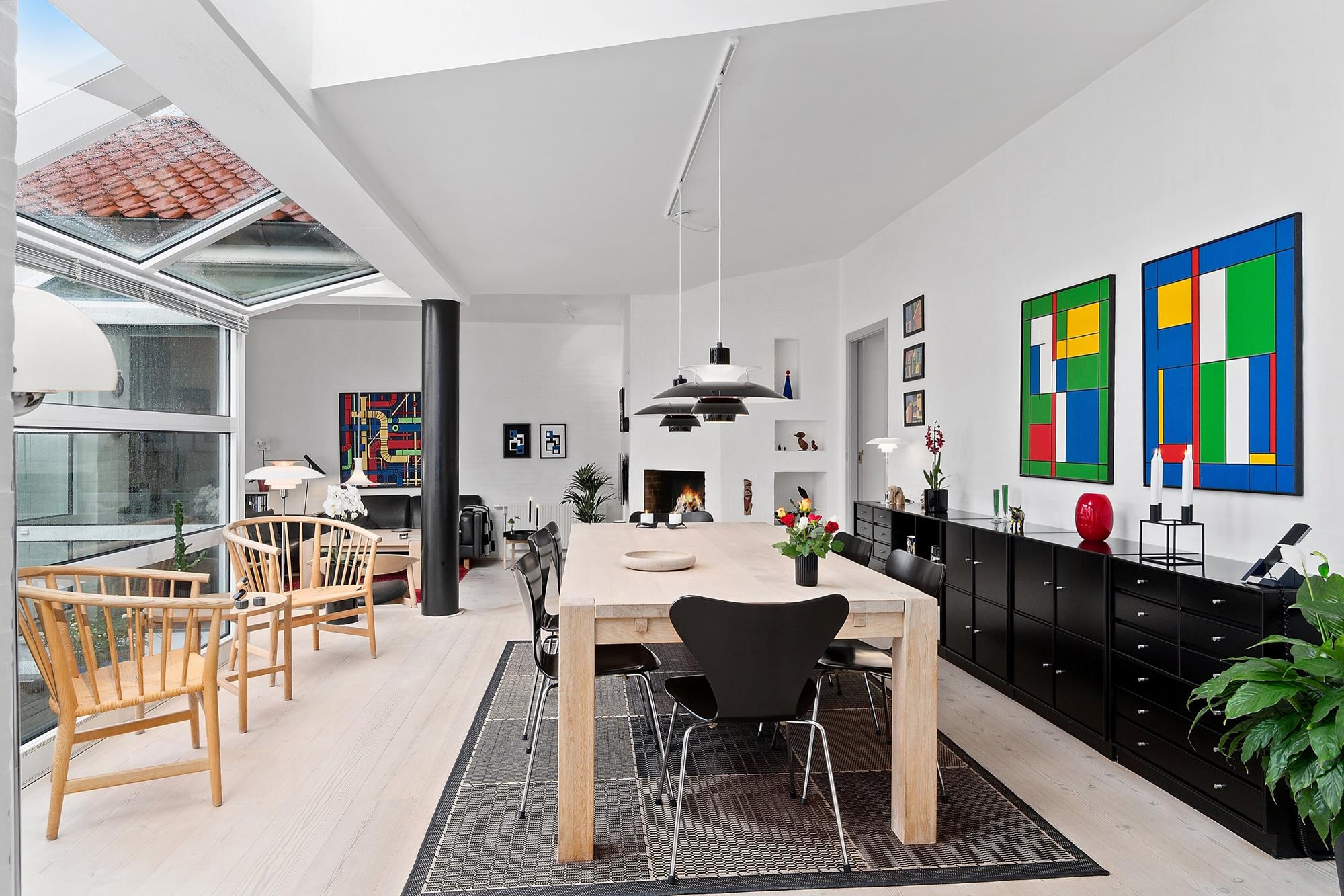 The modern Danish design and architecture in this open-plan spise studio or dining room
