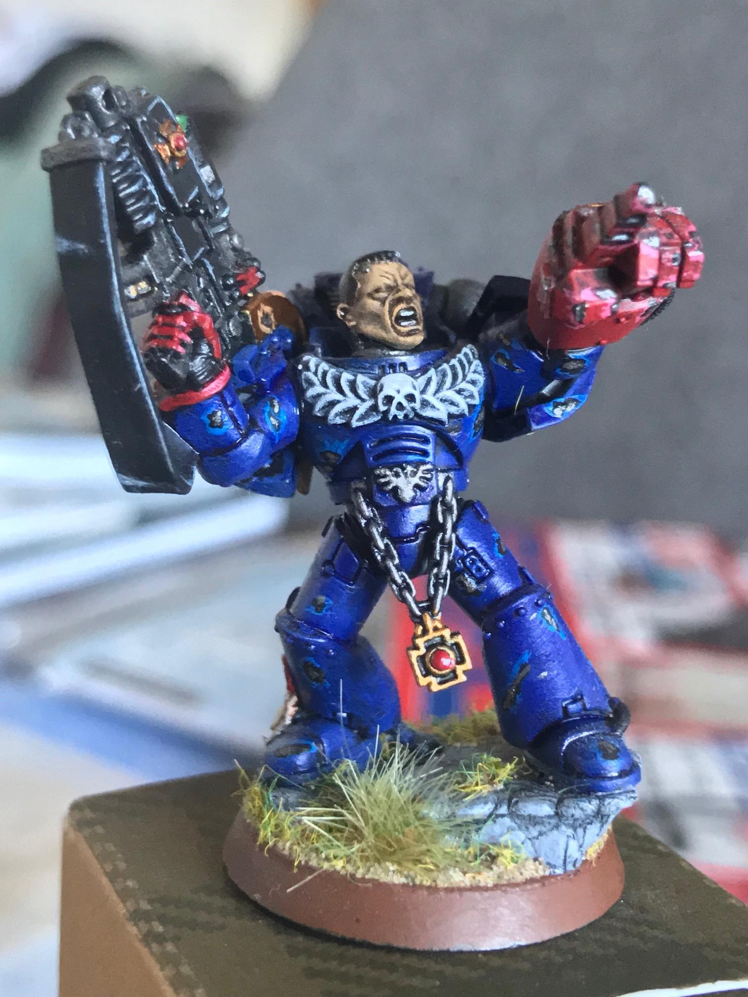 This is a conversion of a Space Marine Sternguard to create the hero of the 4th company, Cortez who amongst the Crimson Fists, is legend. His wargear isn't 100% accurate, however I did make this model many years ago.