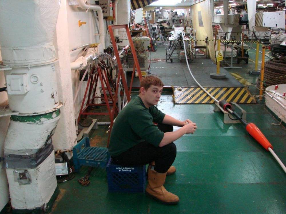 Junior Systems Technician, Mark Hoyle sweating his "what's it's" off aboard the cable repair ship c.s. Pacific Guardian, on a telecommunications cable repair in the middle of the North Atlantic Ocean.