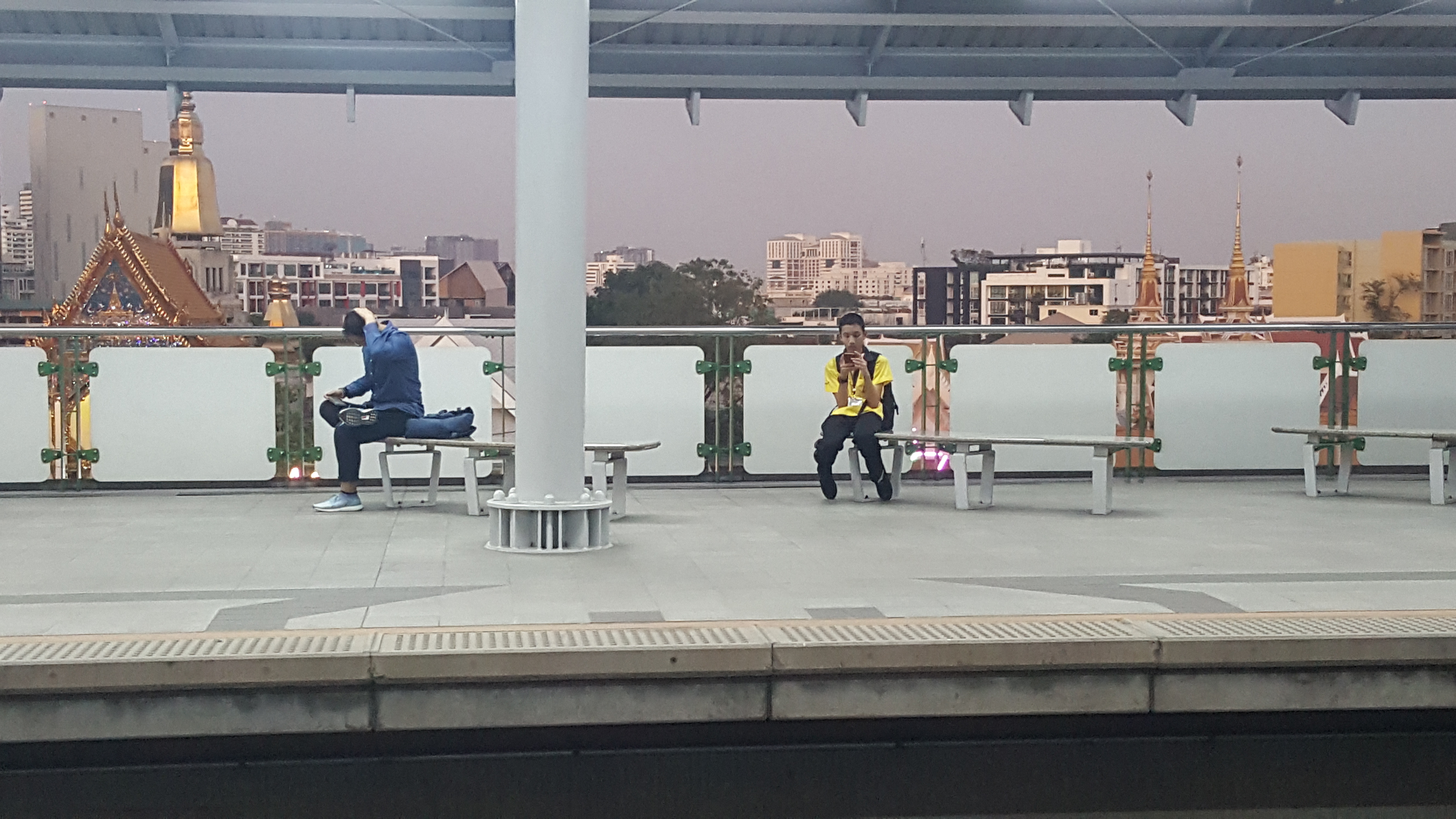 View looking North from the West-bound platform at BTS (Skytrain) Egamai station. I just wanted to capture the last of the evening twilight with the Wat That Thong temple sparling sparkling away in the background.